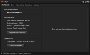 AulapG – эффективное антивирусное программное обеспечение, которое сочетает в себе функции мониторинга системы в режиме реального времени, ручного сканирования и обновления вирусных баз. Программа подходит как начинающим, так и опытным пользователям благодаря интуитивному интерфейсу и отсутствию излишне сложных настроек.