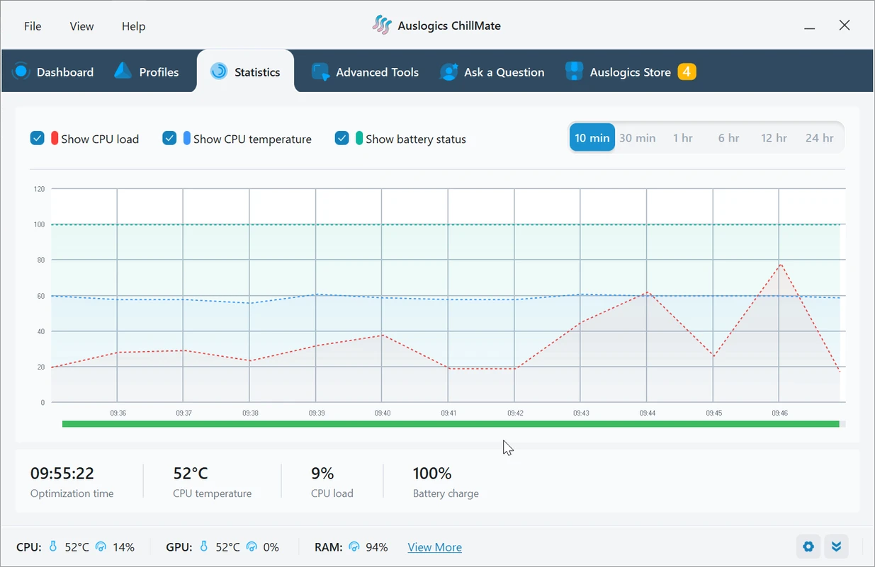 Auslogics ChillMate – мощная программа для управления производительностью ноутбуков и настольных компьютеров, когда уравновешены энергопотребление, температурный режим и быстродействие системы.