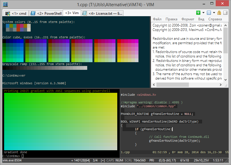ConEmu – бесплатная программная оболочка для работы с консольными приложениями в среде Microsoft Windows, ориентированная на пользователей, которые регулярно используют командную строку и несколько консольных инструментов одновременно.