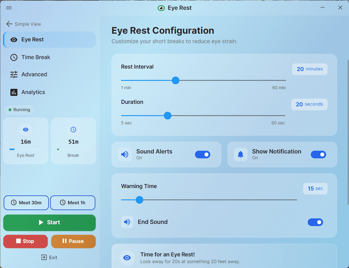 EyeRest – полезная программа для контроля перерывов при работе за компьютером, ориентированное на снижение нагрузки на глаза и поддержание комфортного режима работы.