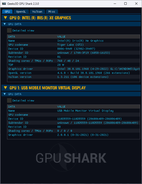 GPU Shark 2 – бесплатная программа для наблюдения за состоянием и анализа характеристик видеокарт, разработанная на платформе GeeXLab, предоставляет пользователю детальную информацию о графическом процессоре и его параметрах функционирования в реальном времени.