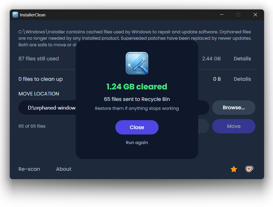 InstallerClean – бесплатное приложение для очистки служебных файлов Windows Installer, которые остаются после установки программ и обновлений. Такие данные сохраняются системой в отдельной папке и со временем могут занимать заметный объём диска. Программа предназначена для поиска и удаления этих остаточных файлов без необходимости ручного анализа.