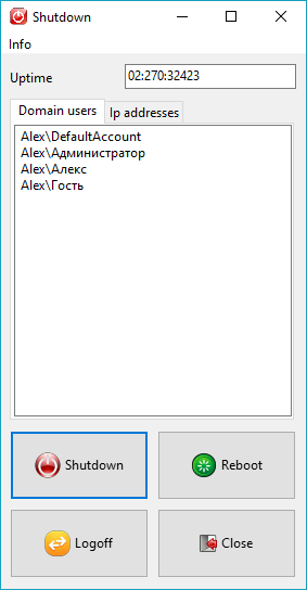 Также встроенные возможности программы позволяют просмотреть перечень зарегистрированных пользователей компьютера, проверить имена и количество активных учётных записей перед совершением критически важных действий. Будет удобна при применении на сенсорных экранах или POS-терминалах, где стандартные кнопки выключения слишком мелки и увеличивают риск ошибочного нажатия.