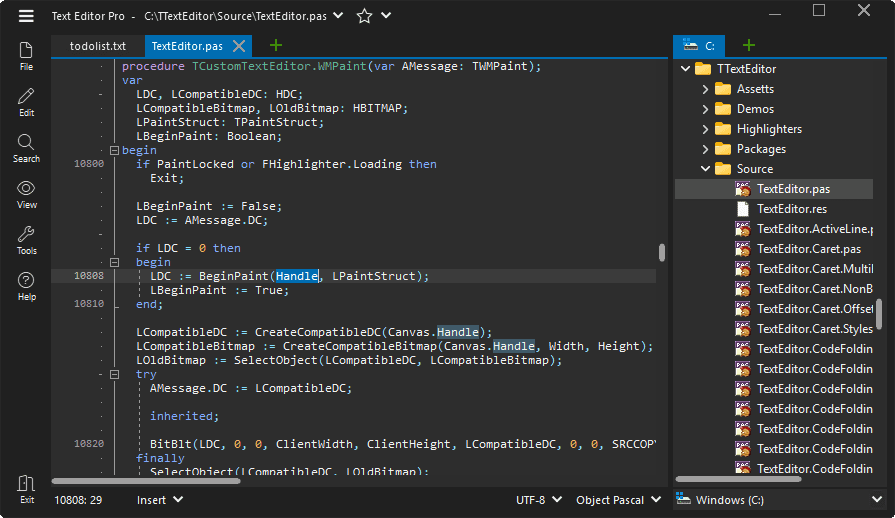 Text Editor Pro – бесплатный редактор для работы с текстовыми файлами и исходным кодом. Инструмент поддерживает подсветку синтаксиса для различных языков программирования и сценариев, что упрощает чтение и редактирование кода. В программе реализованы функции множественного курсора и синхронного редактирования, позволяющие одновременно изменять несколько фрагментов документа.
